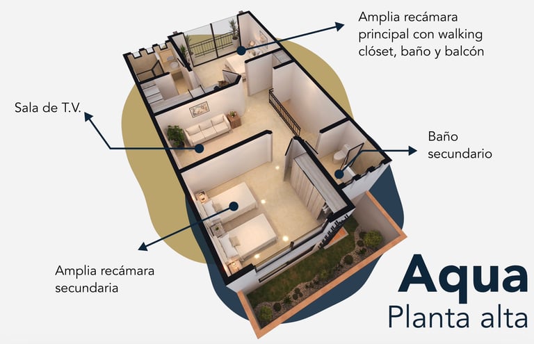 Recamara principal con walking closet baño, recamara con baño compartido, sala de T.V