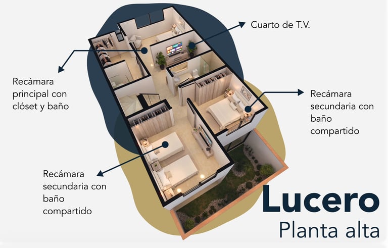 Cuenta con tres recamaras, una recamara con baño y closet, dos recamaras con baño compartido, cuarto de tv